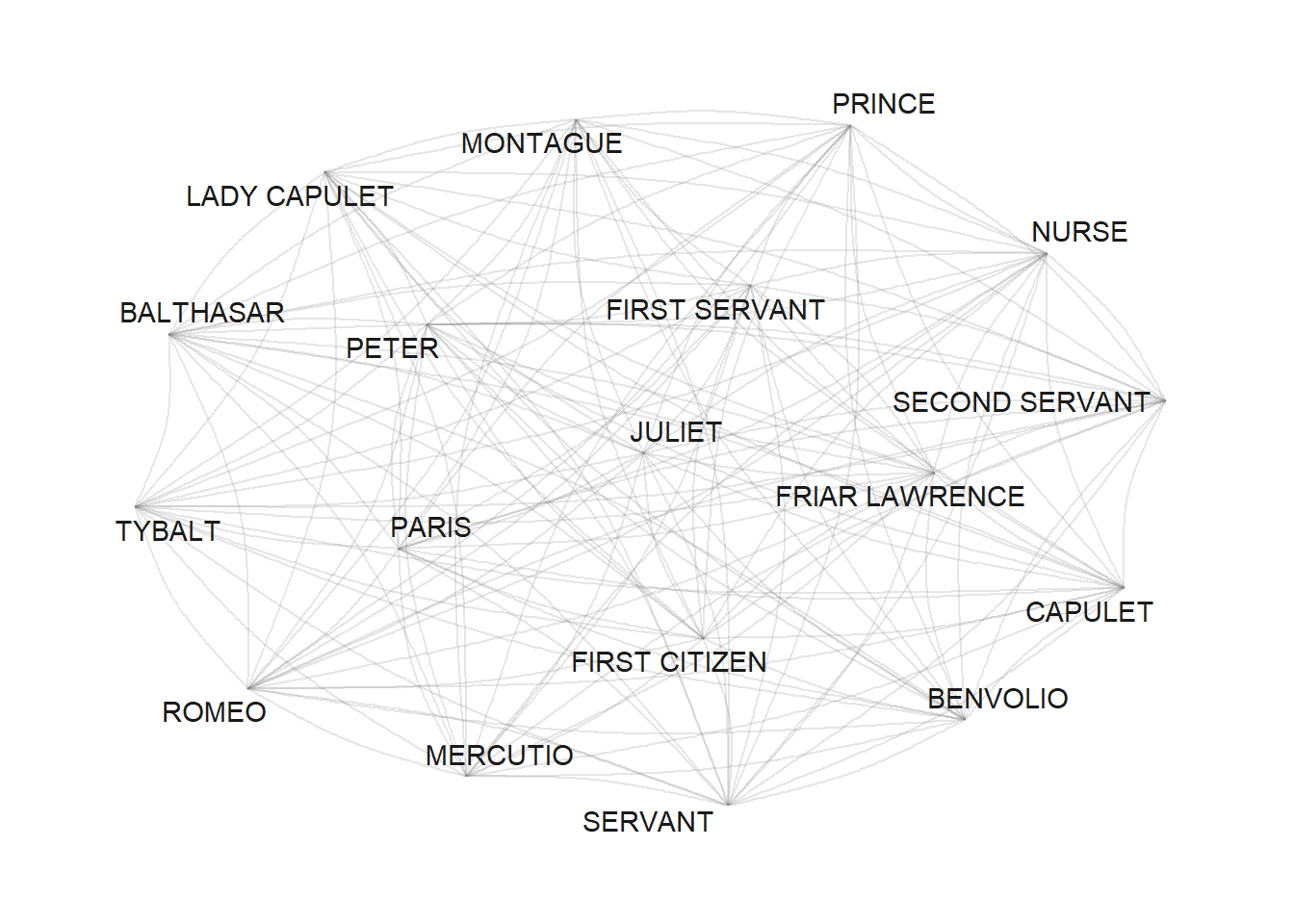 This section shows how to create a network visualization with the network and the GGally packages. The network we will generate shows how often characters in William Shakespeare’s Romeo and Juliet occurred in the same scene. The issue we want to investigate here relates to networks of personas in Shakespeare’s Romeo and Juliet and we thus load this famous work of fiction.